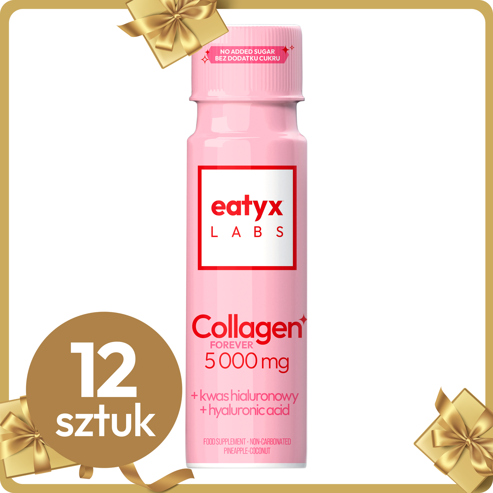 eatyx LABS Collagen Forever 5 000 mg to suplement diety w formie płynu o smaku ananasa i kokosa. Zawiera wysoką dawkę kolagenu wołowego, wzbogacony o kwas hialuronowy, cynk, niacynę i biotynę dla synergii działania i holistycznego podejścia.