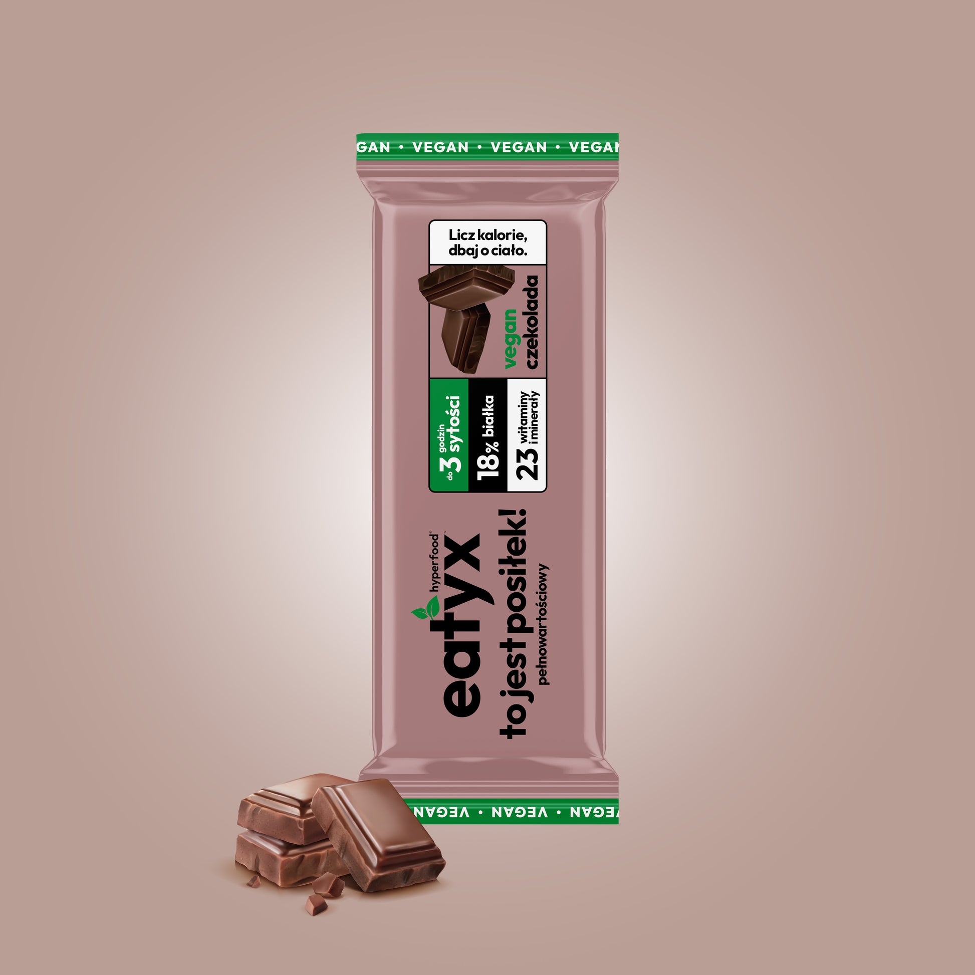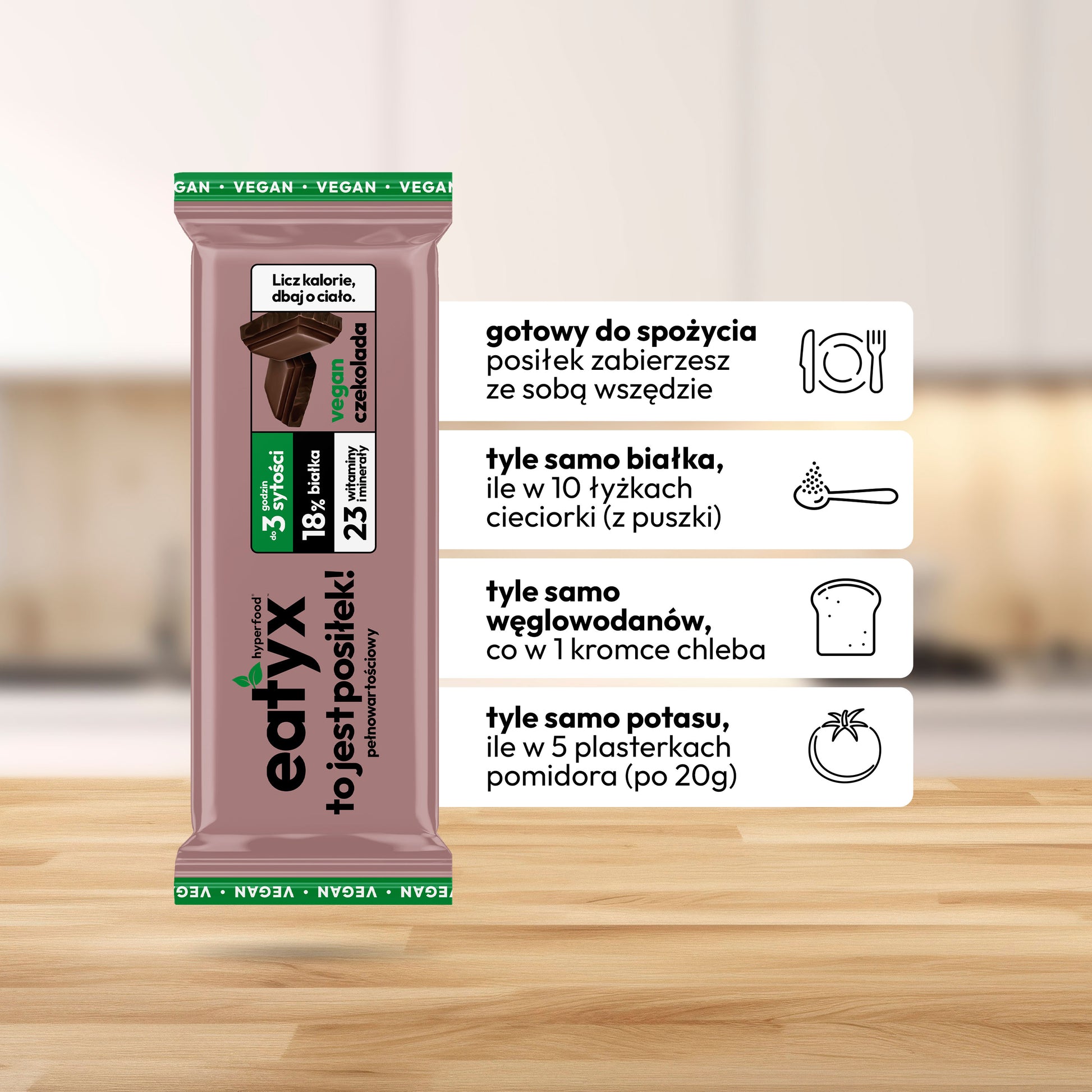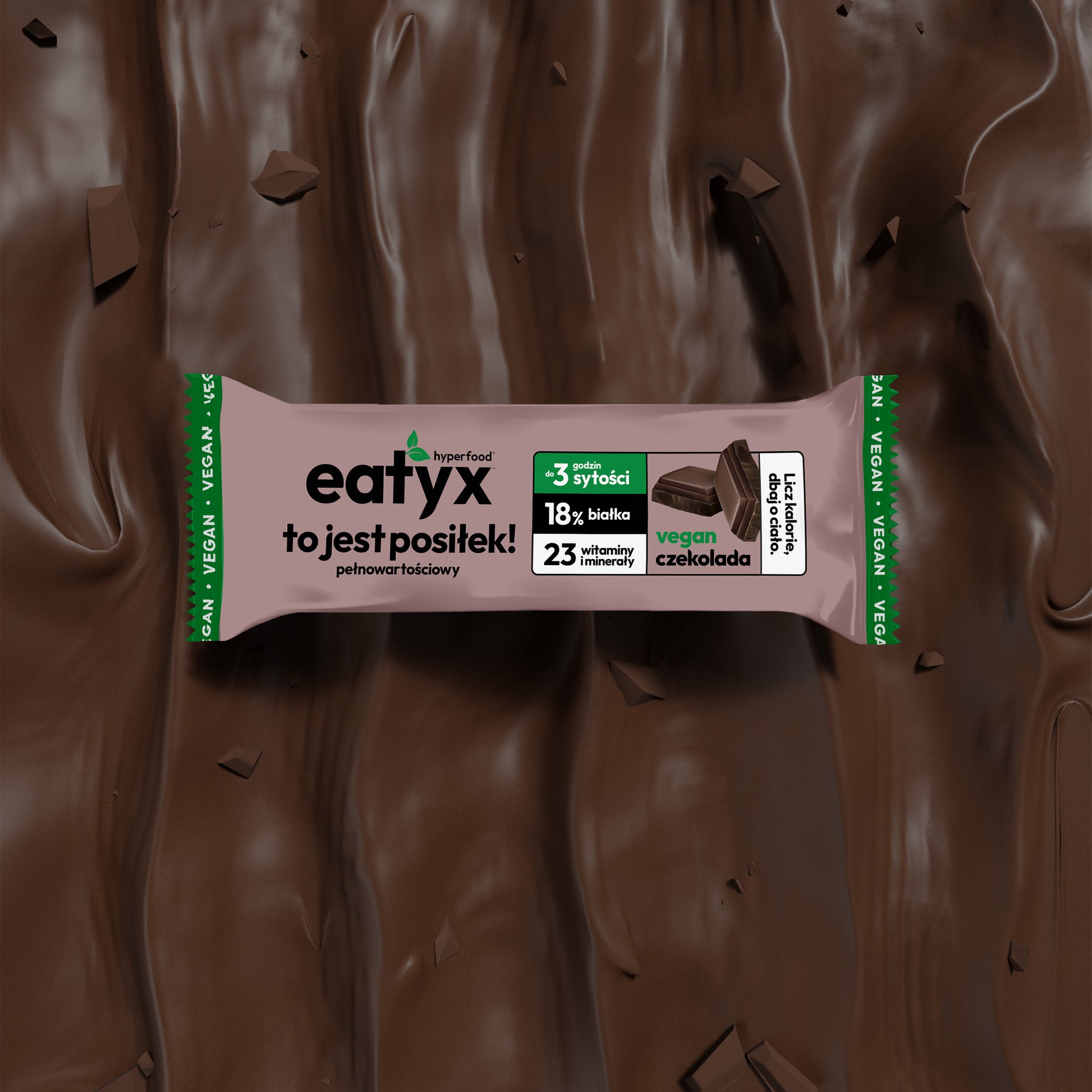 eatyx with chocolate flavor is a modern, healthy and complete meal of the future in the form of a bar that will help you maintain your dream figure and weight control. It can be used to replace any dish during the day: breakfast, lunch or dinner. The carefully developed, balanced composition provides as many nutrients, vitamins and minerals as a traditional meal.