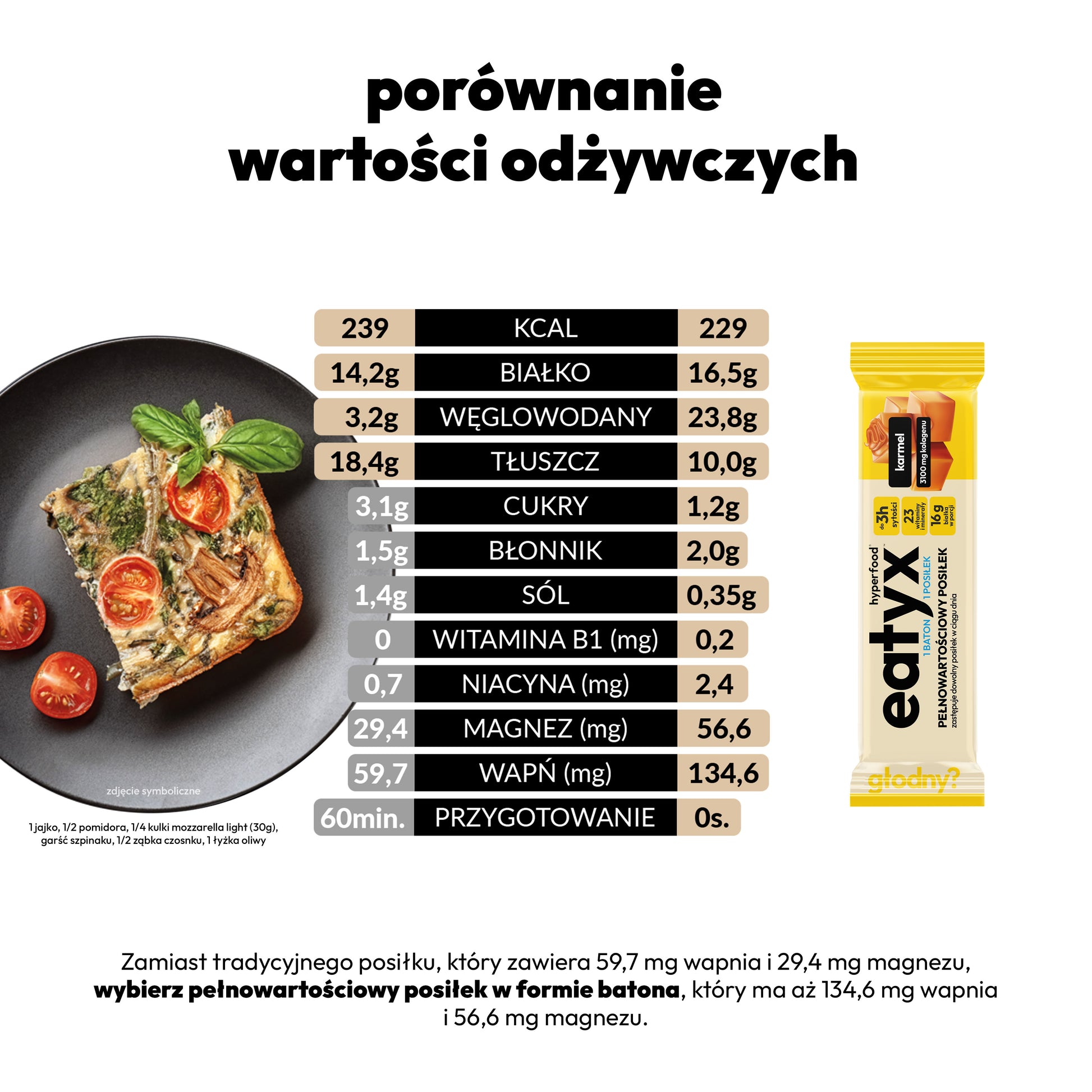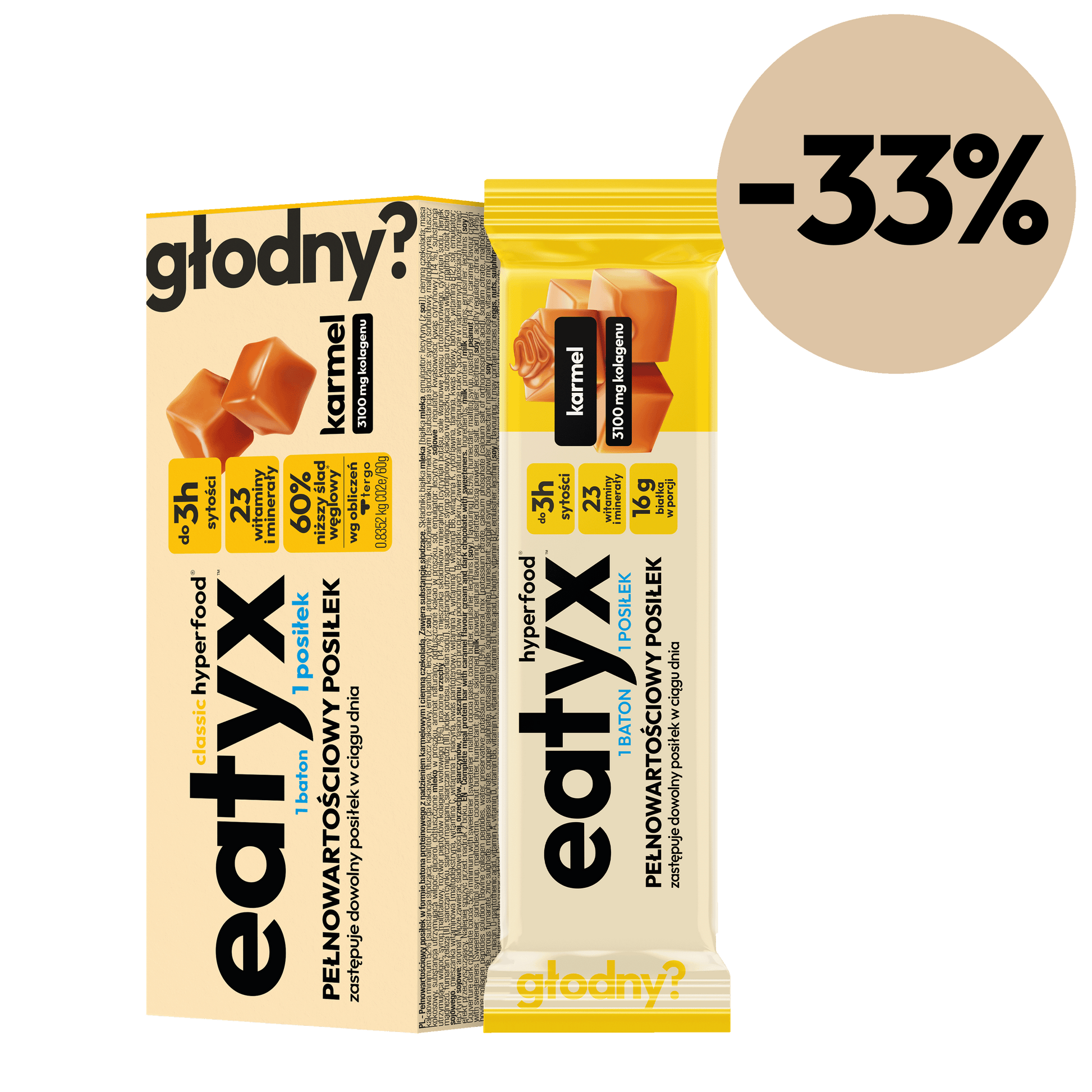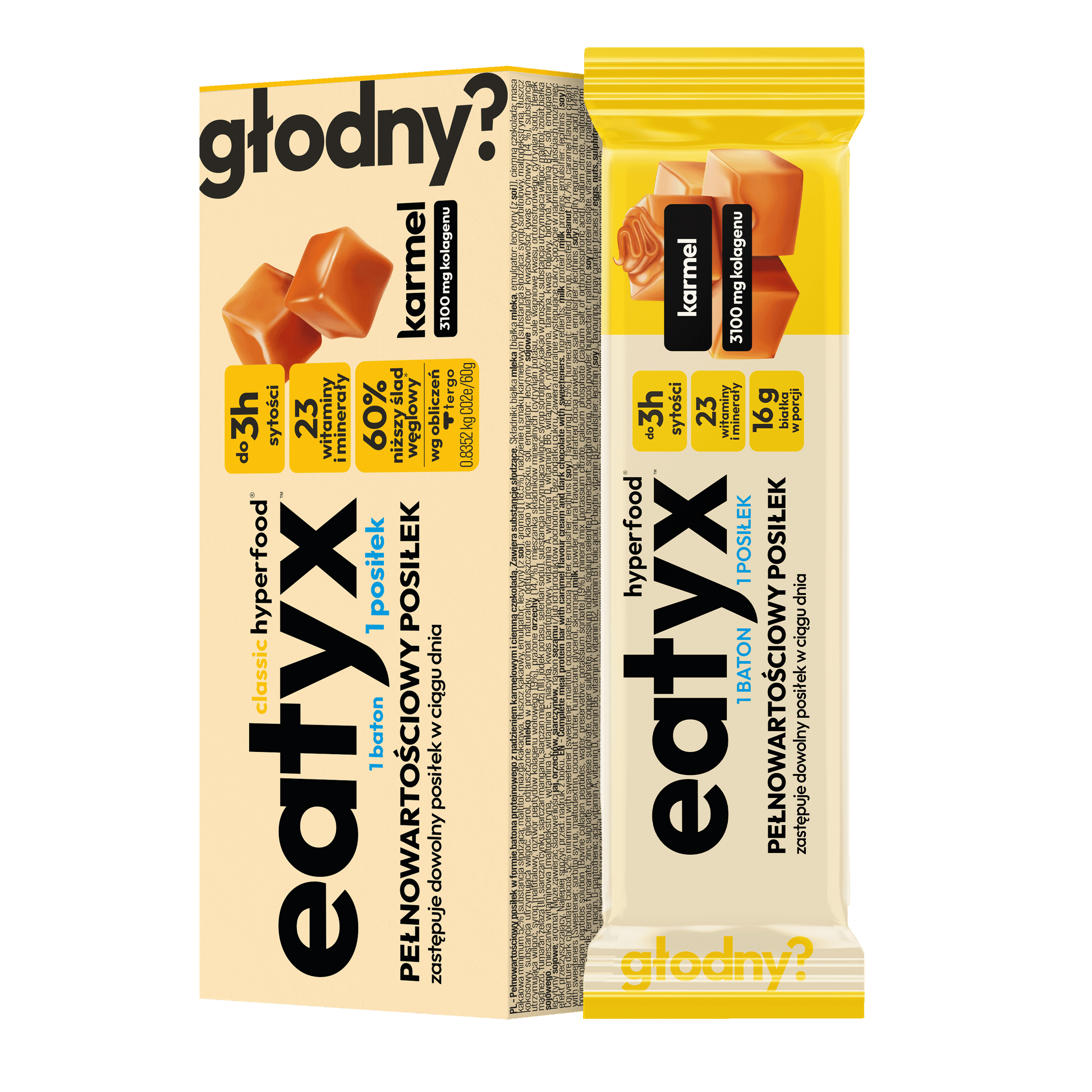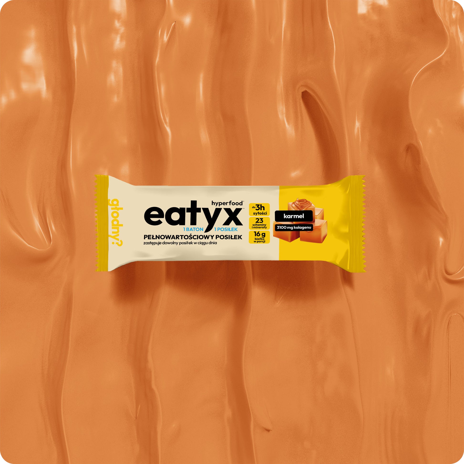 A complete, gluten-free meal in the form of a bar with eatyx caramel filling is not only a delicious snack, but also a balanced and nutritious meal that will provide you with the necessary nutrients in a quick and convenient way. Thanks to the unique form of the bar, you can enjoy a nutritious dish anywhere and at any time, gaining mobility and flexibility in taking care of your health. The stuffed bar fits perfectly into an active lifestyle.
