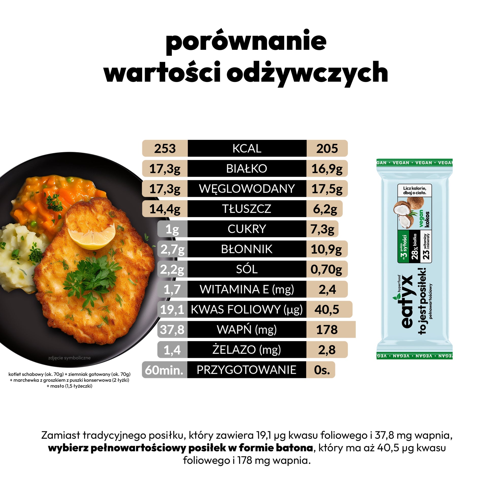 Are you looking for a bar that will not only be a snack, but a complete meal, perfect to eat anywhere and at any time, and will also help you maintain your dream figure and weight control? eatyx with coconut flavor is an excellent substitute for traditional dishes. It provides as many calories as a classic dish, and also contains vitamins and minerals necessary for everyday life. You can eat it at work or school, as part of a meal before or after training. eatyx will also give you energy during outdoor physical activity, such as hiking in the mountains or cycling.