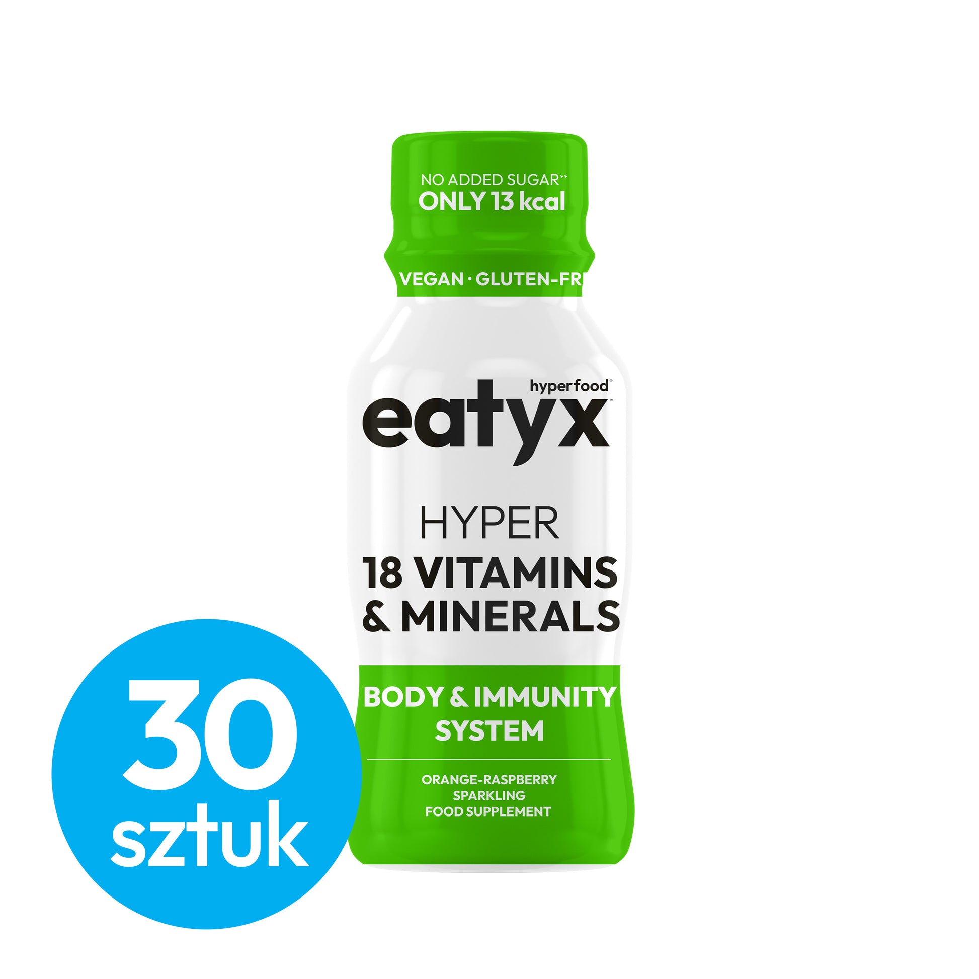 Wzmocnij organizm i zadbaj o odporność z zestawem 30 boosterów HYPER 18 VITAMINS & MINERALS! Każda 95 ml porcja to kompleksowe wsparcie dla Twojego ciała – 18 kluczowych witamin i minerałów w idealnych proporcjach, które pomagają wspomagać i utrzymać zdrowie i witalność przez cały dzień.