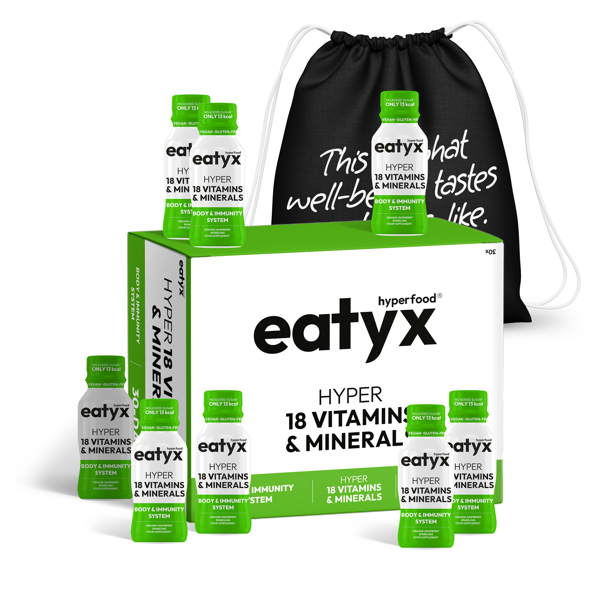 Wzmocnij organizm i zadbaj o odporność z zestawem 30 boosterów HYPER 18 VITAMINS & MINERALS! Każda 95 ml porcja to kompleksowe wsparcie dla Twojego ciała – 18 kluczowych witamin i minerałów w idealnych proporcjach, które pomagają wspomagać i utrzymać zdrowie i witalność przez cały dzień.