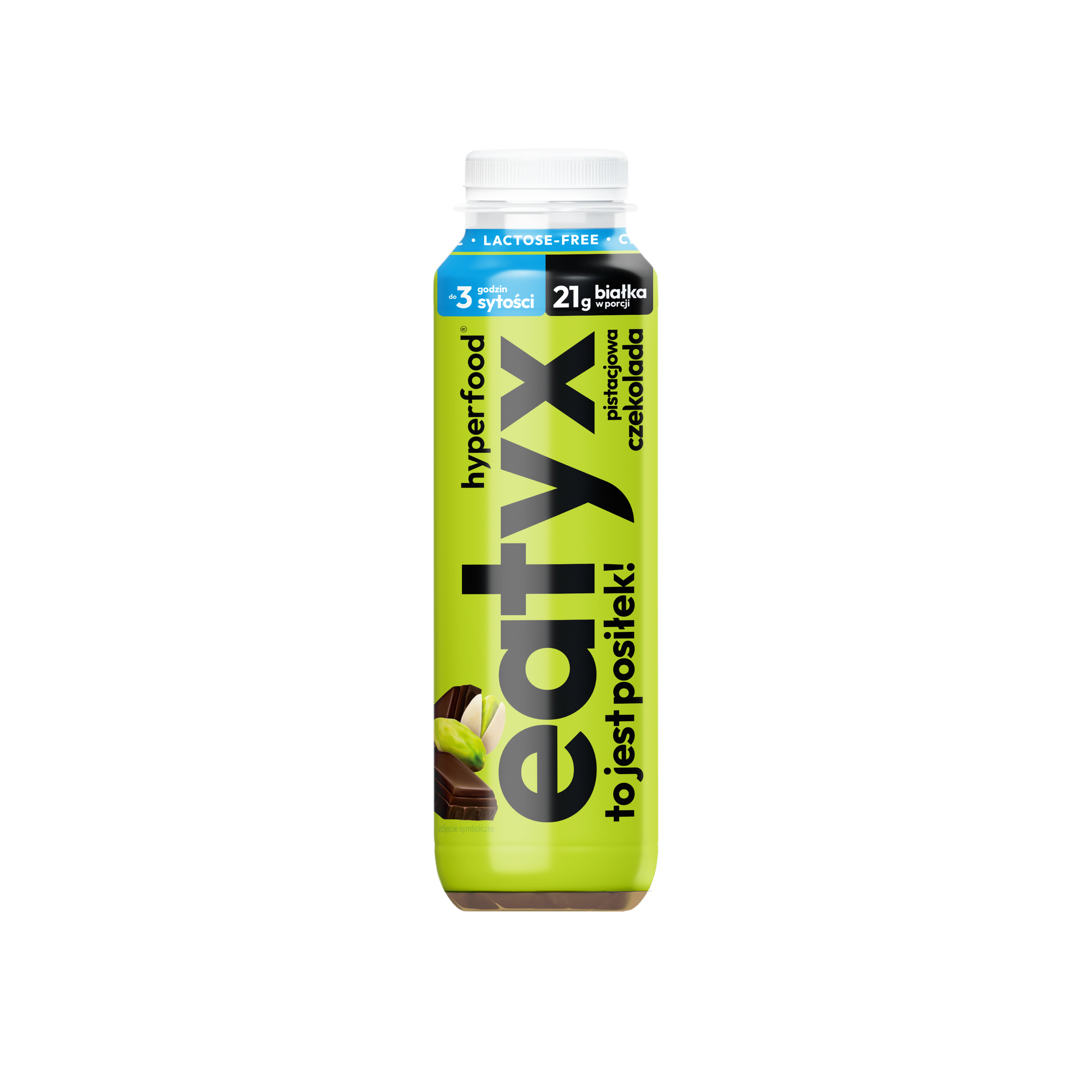 To kompletny, gotowy do spożycia posiłek, w którym aksamitna czekolada harmonijnie łączy się z delikatnym pistacjowym akcentem. Dzięki zbilansowanej formule opartej na białkach mleka bez laktozy, 21 witaminach i minerałach oraz wysokiej zawartości białka, eatyx Pistacjowa Czekolada dostarcza Twojemu organizmowi wszystkiego, czego potrzebuje – w wygodnej i wyjątkowo smacznej formie.