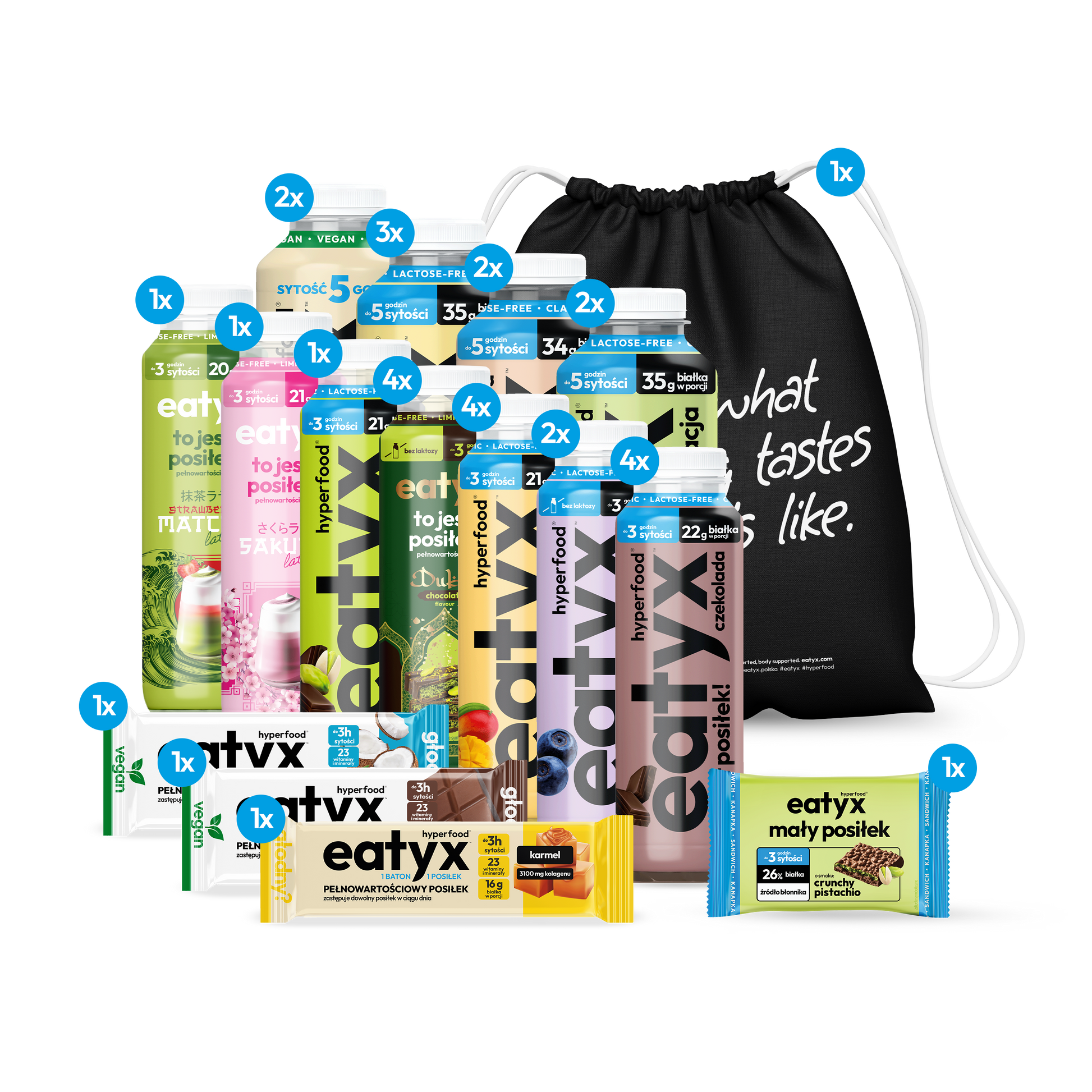 - posiłki w płynie 300 ml (bez laktozy i glutenu): Sakura Latte, Strawberry matcha latte, Dubajska czekolada (4 szt.), Czekolada (4 szt.), Śmietankowa jagoda (2 szt.), Pistacjowa czekolada, Mango (4 szt.),