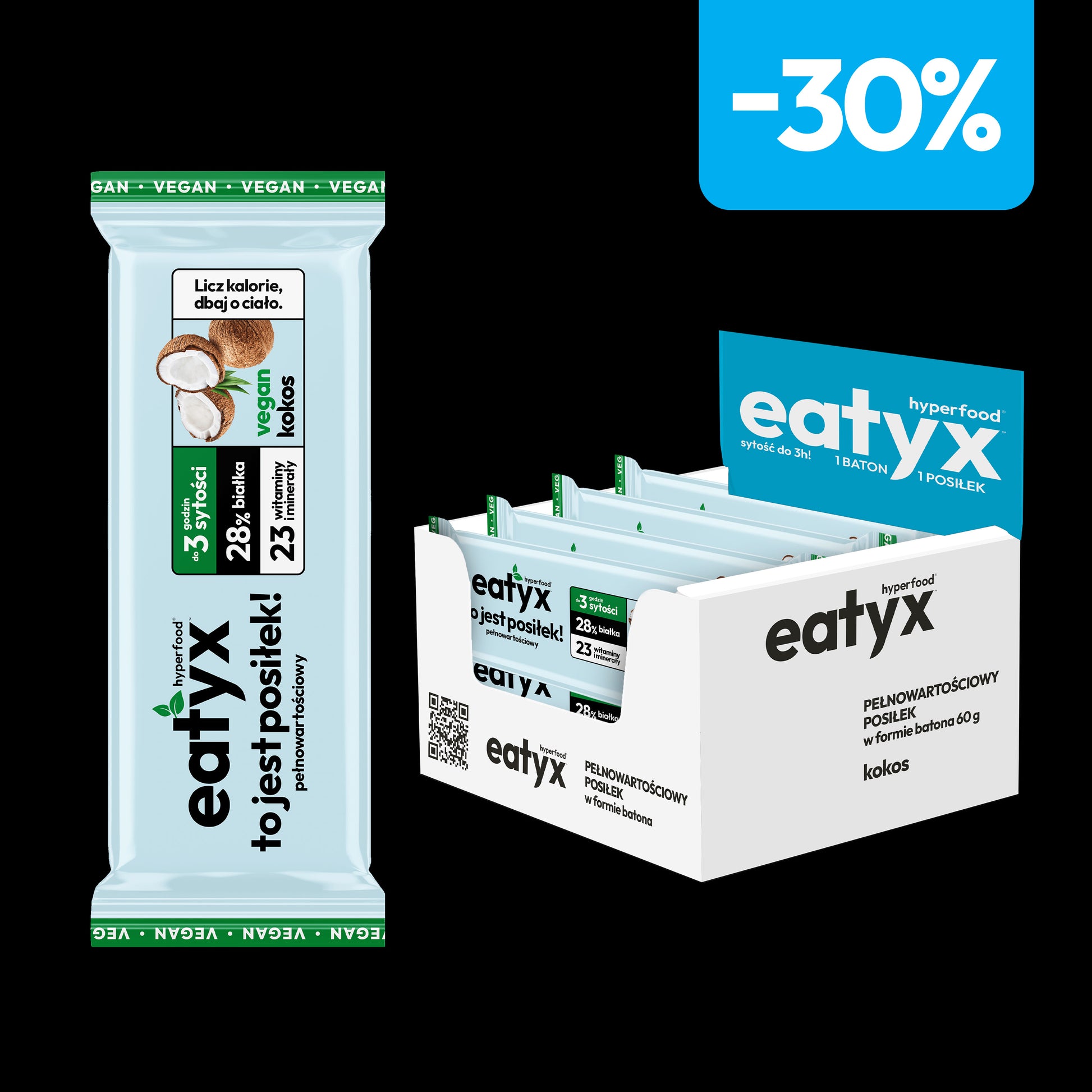 Szukasz batona, który będzie nie tylko przekąską, ale pełnowartościowym posiłkiem, idealnym do zjedzenia w każdym miejscu i o każdej porze, a dodatkowo wspomoże w utrzymaniu wymarzonej sylwetki i kontroli wagi? eatyx o smaku kokosowym to znakomity zamiennik tradycyjnych potraw. Dostarcza tyle kalorii, ile klasyczne danie, a do tego zawiera niezbędne na co dzień witaminy i minerały. Można go zjeść w pracy lub szkole, spożyć w ramach posiłku przed i po treningu. eatyx doda Ci też energii w trakcie aktywności fizycznej na świeżym powietrzu, takiej jak wycieczki piesze po górach czy rowerowe przejażdżki.